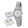 Marea para niña de la colección de comunión fabricado en acero inoxidable plateado. Estamos ante un Reloj de diseño elegante y atractivo compuesto por caja de 27mm de diámetro con bisel interior morado y esfera blanca con indicadores y agujas en plateado movidas por mecanismo de cuarzo analógico. Todo ello protegido por cristal mineral. Su brazalete lo forman eslabones plateados con cierre desplegable. Resistente al agua hasta 3 ATM. Incluye Auriculares Inalámbricos.